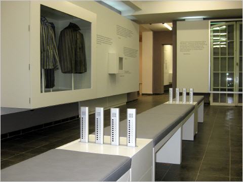 Die Auslösung der Tonstücke erfolgt über die am Einhandhörer angebrachten Tasten. Je nach Anzahl der Tonstücke, die abgerufen werden sollen, statten wir die Hörer mit 3 - 11 Tasten aus. Die Aufhängung erfolgt über einen Metallstift mit Kerbe.